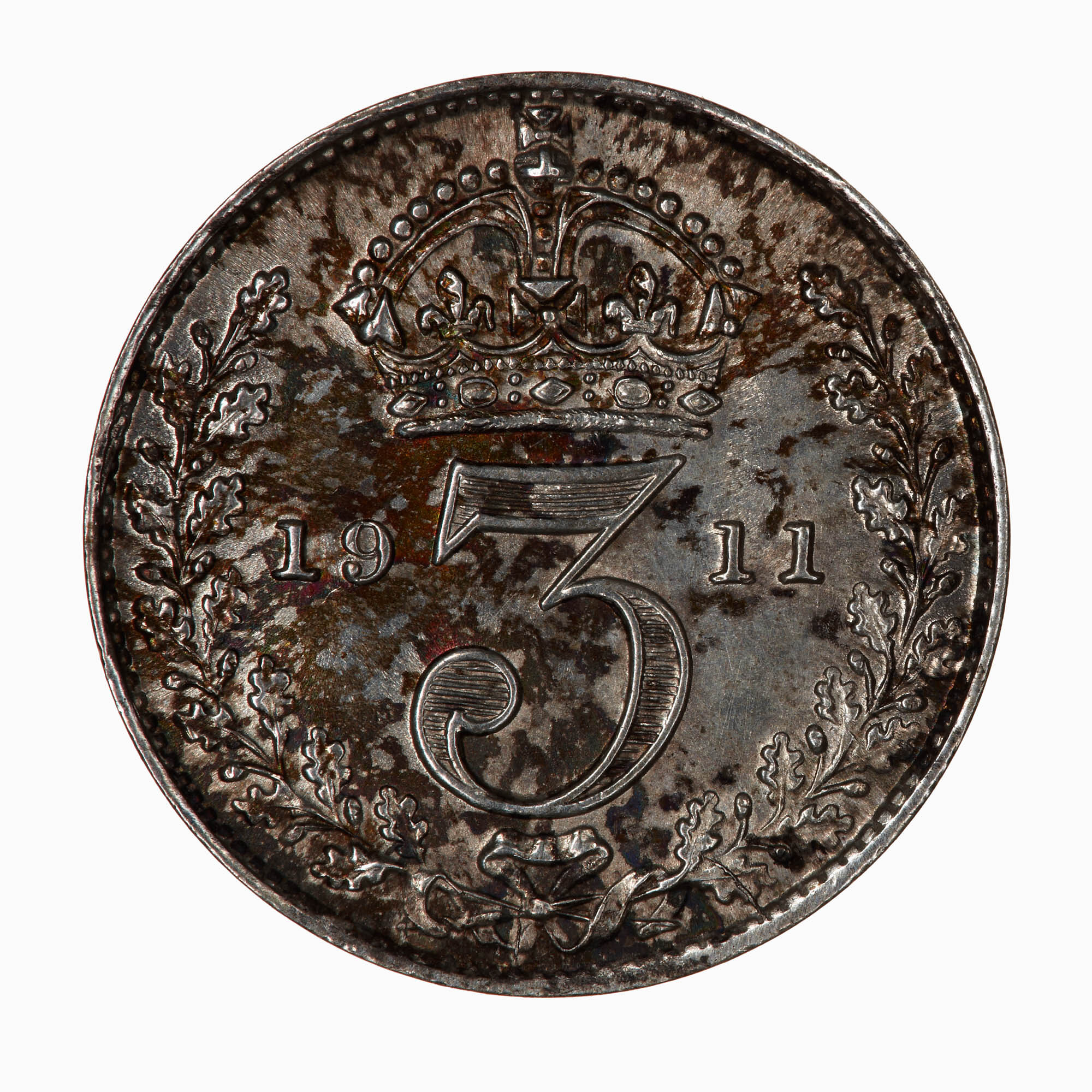 Within an open oak wreath the numeral 3 dividing the date 1911; above, crown.
