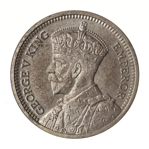 Crowned bust of George V facing left (extends to rim); around, GEORGE V KING EMPEROR (by Percy Metcalf)