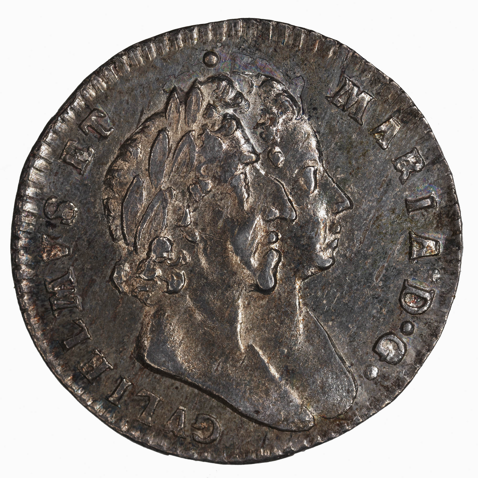 Mary was the daughter of James II. For reasons of politics she had married William of Orange, James II nephew and left England to live with him in the Netherlands. When James II lost support, William was invited to invade England and to take over the throne jointly with his wife. James II escaped to France and live there in exile until his death. This coin is listed by Grueber as a Maundy piece. The 9 in the date is over a 6.