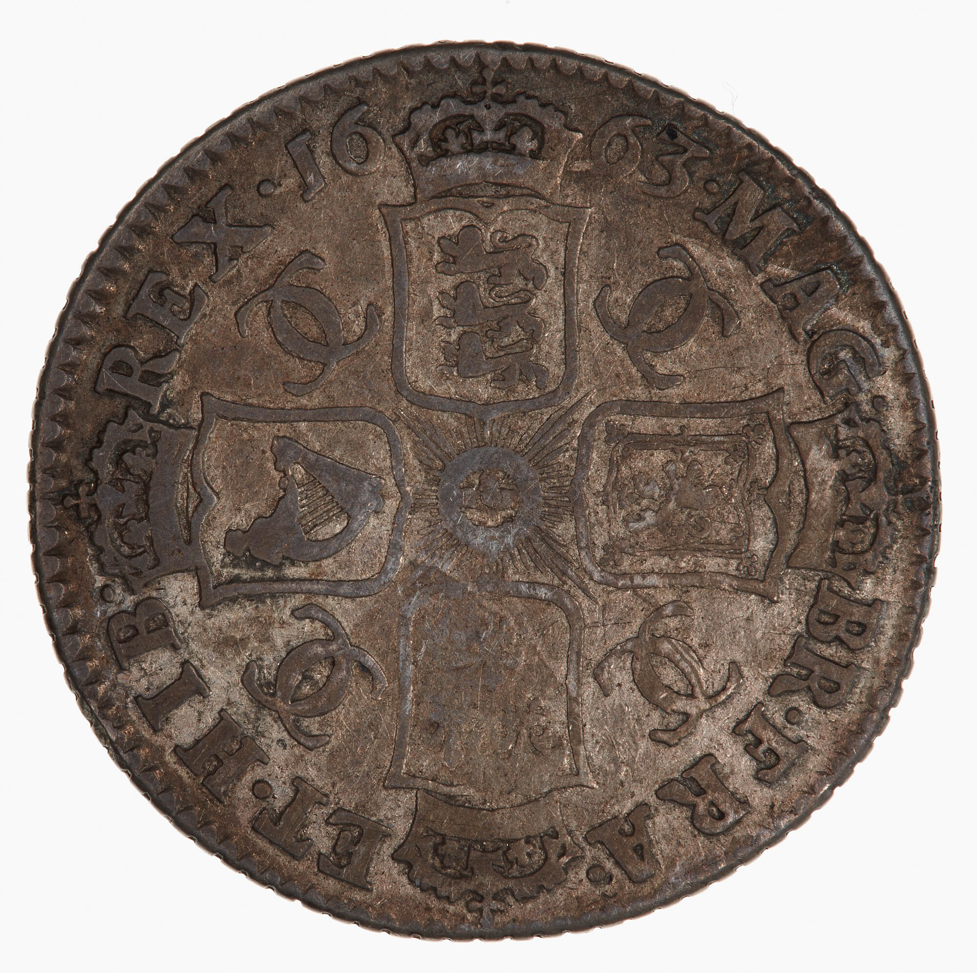 Four crowned shields, bearing the arms of England, Scotland, France and Ireland, formed to make a cross with the Star of the Garter at the centre; in the angles, two interlinked Cs; around, MAG BR FRA ET HIB REX 1663, the date being divided by the crown above the English arms.