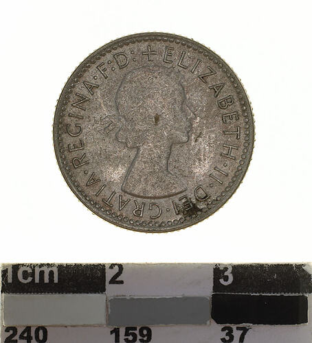 A silver coin (19 mm diameter with milled edge) featuring a laureate head of Elizabeth II facing right; around, + ELIZABETH . II . DEI . GRATIA . REGINA . F: D:. The reverse features the Ensigns Armorial of the Commonwealth of Australia, as authorised by Royal Warrent 7th May 1908 - composed of a simple shield enclosing a cross of Saint George on which are five six-pointed stars, around the outside of which are six small escutcheons, i.e., small shields. The shield is supported by a kangaroo and an emu standing on a grassy mound. Above the shield a crest, the seven-pointed star of Federation on a wreath. Below on a ribbon the motto ADVANCE AUSTRALIA is inscribed. Around above, SIXPENCE and below, between arrow heads, the date, 1956.