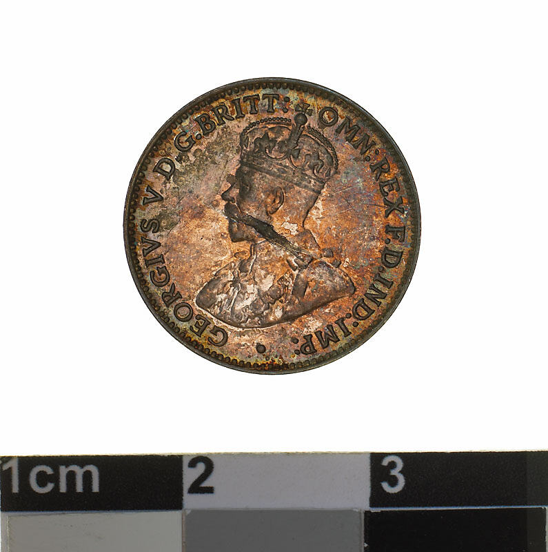 A silver coin (16 mm diameter with plain edge) featuring a crowned and robed bust of George V facing left; around, GEORGIVS V D.G. BRITT: OMN: REX F.D. IND: IMP: ; below bust in small lettering the artist's initials B.M.. The reverse features the Ensigns Armorial of the Commonwealth of Australia, as authorised by Royal Warrent 7th May 1908 - composed of a simple shield enclosing a cross of Saint George on which are five six-pointed stars, around the outside of which are six small escutcheons, i.e., small shields. The shield is supported by a kangaroo and an emu standing on a grassy mound. Above the shield a crest, the seven-pointed star of Federation on a wreath. Below on a ribbon the motto ADVANCE AUSTRALIA is inscribed. Around above, THREEPENCE and below, between arrow heads, the date, 1928.