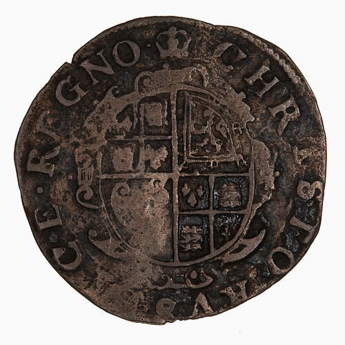 Garnished oval shield quartered with combined arms of England and France (1st and 4th), Scotland and Ireland; around, CHRISTO AVSPICE REGNO (mm. crown) (translation: I reign under the auspices of Christ)