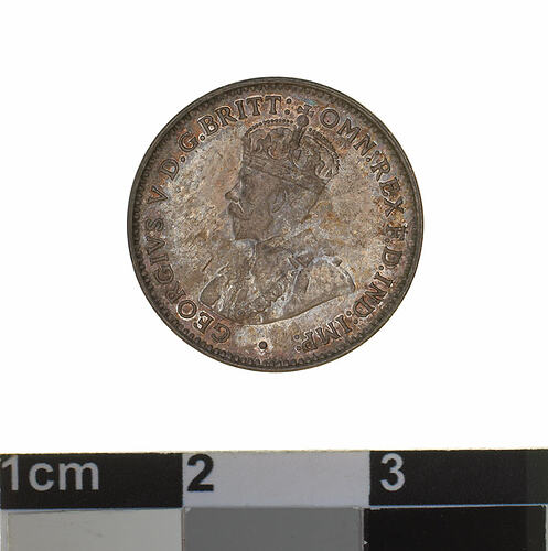 A silver coin (16 mm diameter with plain edge) featuring a crowned and robed bust of George V facing left; around, GEORGIVS V D.G. BRITT: OMN: REX F.D. IND: IMP: ; below bust in small lettering the artist's initials B.M. The reverse features the Ensigns Armorial of the Commonwealth of Australia, as authorised by Royal Warrent 7th May 1908 - composed of a simple shield enclosing a cross of Saint George on which are five six-pointed stars, around the outside of which are six small escutcheons, i.e., small shields. The shield is supported by a kangaroo and an emu standing on a grassy mound. Above the shield a crest, the seven-pointed star of Federation on a wreath. Below on a ribbon the motto ADVANCE AUSTRALIA is inscribed. Around above, THREEPENCE and below, between arrow heads, the date, 1921. The mint mark M is below the date.