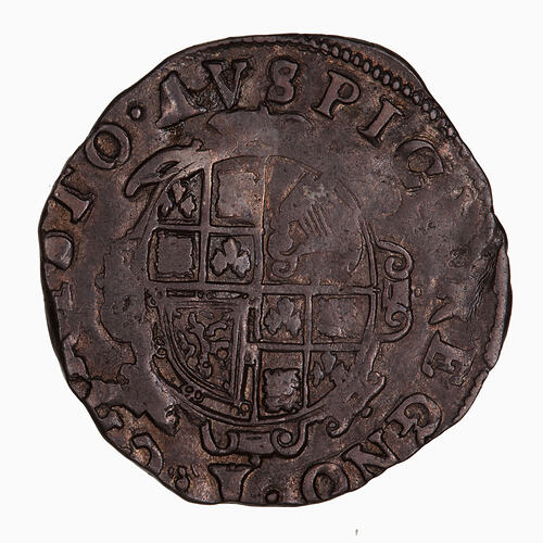 Garnished oval shield quartered with combined arms of England and France (1st and 4th), Scotland and Ireland; around, CHRISTO AVSPICE REGNO (mm. bell) (translation: I reign under the auspices of Christ)