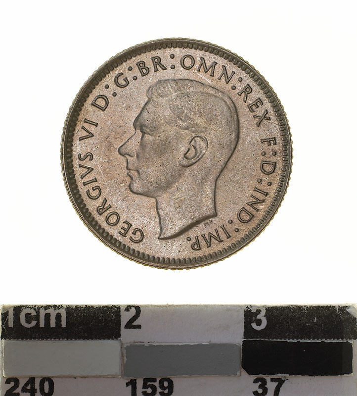 A silver coin (19 mm diameter with milled edge) featuring a bare head of George VI facing left; around, GEORGIVS VI D: G: BR: OMN: REX F. D. IND: IMP. ; below bust in small lettering the artist's initials H.P.. The reverse features the Ensigns Armorial of the Commonwealth of Australia, as authorised by Royal Warrent 7th May 1908 - composed of a simple shield enclosing a cross of Saint George on which are five six-pointed stars, around the outside of which are six small escutcheons, i.e., small shields. The shield is supported by a kangaroo and an emu standing on a grassy mound. Above the shield a crest, the seven-pointed star of Federation on a wreath. Below on a ribbon the motto ADVANCE AUSTRALIA is inscribed. Around above, SIXPENCE and below, between arrow heads, the date, 1942.