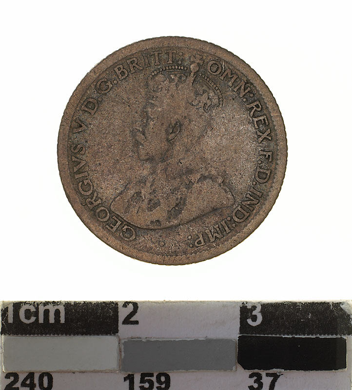 A silver coin (19 mm diameter with milled edge) featuring a crowned and robed bust of George V facing left; around, GEORGIVS V D.G. BRITT: OMN: REX F.D. IND: IMP: ; below bust in small lettering the artist's initials B.M.. The reverse features the Ensigns Armorial of the Commonwealth of Australia, as authorised by Royal Warrent 7th May 1908 - composed of a simple shield enclosing a cross of Saint George on which are five six-pointed stars, around the outside of which are six small escutcheons, i.e., small shields. The shield is supported by a kangaroo and an emu standing on a grassy mound. Above the shield a crest, the seven-pointed star of Federation on a wreath. Below on a ribbon the motto ADVANCE AUSTRALIA is inscribed. Around above, SIXPENCE and below, between arrow heads, the date, 1923.