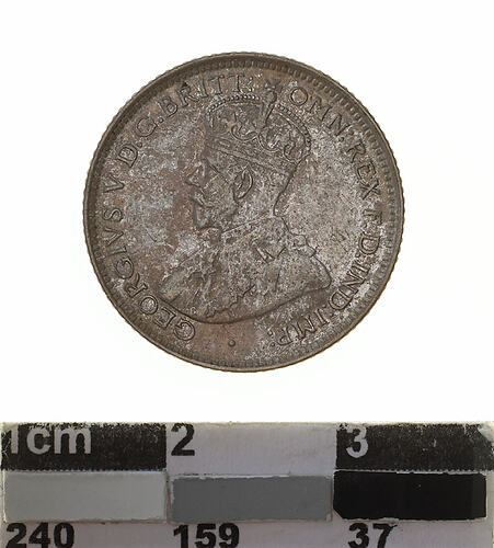 A silver coin (19 mm diameter with milled edge) featuring a crowned and robed bust of George V facing left; around, GEORGIVS V D.G. BRITT: OMN: REX F.D. IND: IMP: ; below bust in small lettering the artist's initials B.M.. The reverse features the Ensigns Armorial of the Commonwealth of Australia, as authorised by Royal Warrent 7th May 1908 - composed of a simple shield enclosing a cross of Saint George on which are five six-pointed stars, around the outside of which are six small escutcheons, i.e., small shields. The shield is supported by a kangaroo and an emu standing on a grassy mound. Above the shield a crest, the seven-pointed star of Federation on a wreath. Below on a ribbon the motto ADVANCE AUSTRALIA is inscribed. Around above, SIXPENCE and below, between arrow heads, the date, 1925.