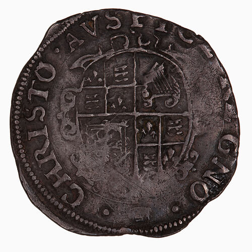 Garnished oval shield quartered with combined arms of England and France (1st and 4th), Scotland and Ireland; around, CHRISTO AVSPICE REGNO (mm. tun) (translation: I reign under the auspices of Christ)