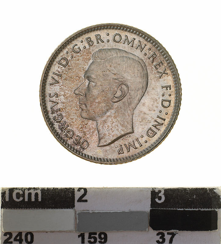 A silver coin (19 mm diameter with milled edge) featuring a bare head of George VI facing left; around, GEORGIVS VI D: G: BR: OMN: REX F. D. IND: IMP: ; below bust in small lettering the artist's initials H.P.. The reverse features the Ensigns Armorial of the Commonwealth of Australia, as authorised by Royal Warrent 7th May 1908 - composed of a simple shield enclosing a cross of Saint George on which are five six-pointed stars, around the outside of which are six small escutcheons, i.e., small shields. The shield is supported by a kangaroo and an emu standing on a grassy mound. Above the shield a crest, the seven-pointed star of Federation on a wreath. Below on a ribbon the motto ADVANCE AUSTRALIA is inscribed. Around above, SIXPENCE and below, between arrow heads, the date, 1942. Above the date is the mint mark S.
