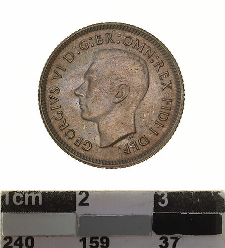A silver coin (19 mm diameter with milled edge) featuring a bare head of George VI facing left; around, GEORGIVS VI D:G:BR:OMN:REX FIDEI DEF. ; below bust in small lettering the artist's initials H.P.. The reverse features the Ensigns Armorial of the Commonwealth of Australia, as authorised by Royal Warrent 7th May 1908 - composed of a simple shield enclosing a cross of Saint George on which are five six-pointed stars, around the outside of which are six small escutcheons, i.e., small shields. The shield is supported by a kangaroo and an emu standing on a grassy mound. Above the shield a crest, the seven-pointed star of Federation on a wreath. Below on a ribbon the motto ADVANCE AUSTRALIA is inscribed. Around above, SIXPENCE and below, between arrow heads, the date, 1950.