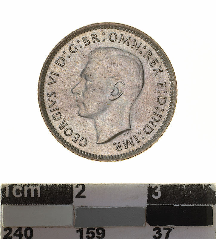A silver coin (19 mm diameter with milled edge) featuring a bare head of George VI facing left; around, GEORGIVS VI D: G: BR: OMN: REX F. D. IND: IMP. ; below bust in small lettering the artist's initials H.P.. The reverse features the Ensigns Armorial of the Commonwealth of Australia, as authorised by Royal Warrent 7th May 1908 - composed of a simple shield enclosing a cross of Saint George on which are five six-pointed stars, around the outside of which are six small escutcheons, i.e., small shields. The shield is supported by a kangaroo and an emu standing on a grassy mound. Above the shield a crest, the seven-pointed star of Federation on a wreath. Below on a ribbon the motto ADVANCE AUSTRALIA is inscribed. Around above, SIXPENCE and below, between arrow heads, the date, 1945.