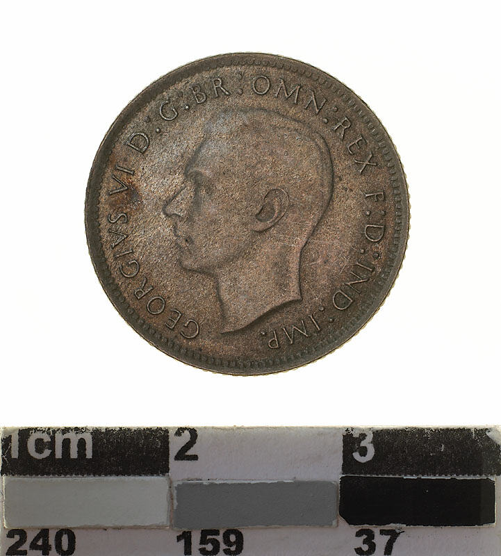 A silver coin (19 mm diameter with milled edge) featuring a bare head of George VI facing left; around, GEORGIVS VI D: G: BR: OMN: REX F: D: IND: IMP. ; below bust in small lettering the artist's initials H.P.. The reverse features the Ensigns Armorial of the Commonwealth of Australia, as authorised by Royal Warrent 7th May 1908 - composed of a simple shield enclosing a cross of Saint George on which are five six-pointed stars, around the outside of which are six small escutcheons, i.e., small shields. The shield is supported by a kangaroo and an emu standing on a grassy mound. Above the shield a crest, the seven-pointed star of Federation on a wreath. Below on a ribbon the motto ADVANCE AUSTRALIA is inscribed. Around above, SIXPENCE and below, between arrow heads, the date, 1946.