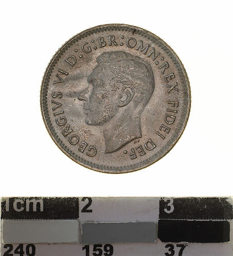 A silver coin (19 mm diameter with milled edge) featuring a bare head of George VI facing left; around, GEORGIVS VI D:G:BR:OMN:REX FIDEI DEF. ; below bust in small lettering the artist's initials H.P.. The reverse features the Ensigns Armorial of the Commonwealth of Australia, as authorised by Royal Warrent 7th May 1908 - composed of a simple shield enclosing a cross of Saint George on which are five six-pointed stars, around the outside of which are six small escutcheons, i.e., small shields. The shield is supported by a kangaroo and an emu standing on a grassy mound. Above the shield a crest, the seven-pointed star of Federation on a wreath. Below on a ribbon the motto ADVANCE AUSTRALIA is inscribed. Around above, SIXPENCE and below, between arrow heads, the date, 1950.
