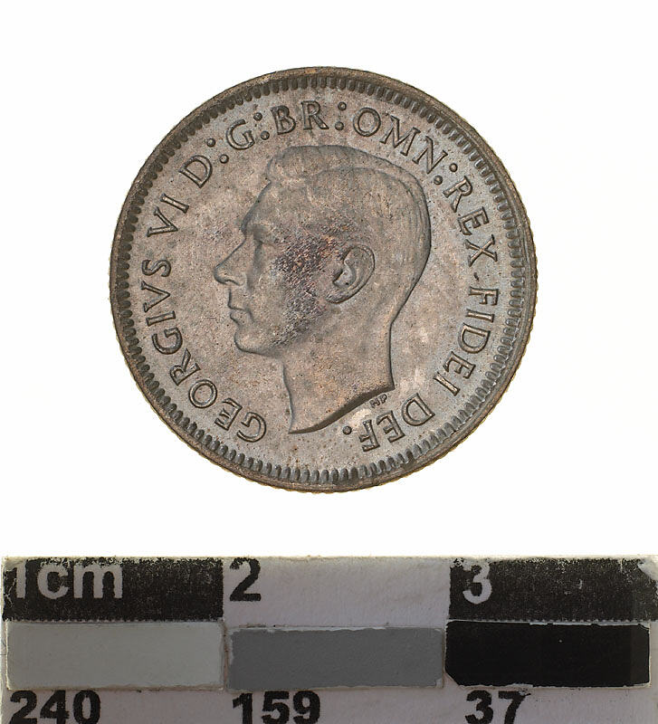 A silver coin (19 mm diameter with milled edge) featuring a bare head of George VI facing left; around, GEORGIVS VI D:G:BR:OMN:REX FIDEI DEF. ; below bust in small lettering the artist's initials H.P.. The reverse features the Ensigns Armorial of the Commonwealth of Australia, as authorised by Royal Warrent 7th May 1908 - composed of a simple shield enclosing a cross of Saint George on which are five six-pointed stars, around the outside of which are six small escutcheons, i.e., small shields. The shield is supported by a kangaroo and an emu standing on a grassy mound. Above the shield a crest, the seven-pointed star of Federation on a wreath. Below on a ribbon the motto ADVANCE AUSTRALIA is inscribed. Around above, SIXPENCE and below, between arrow heads, the date, 1951.