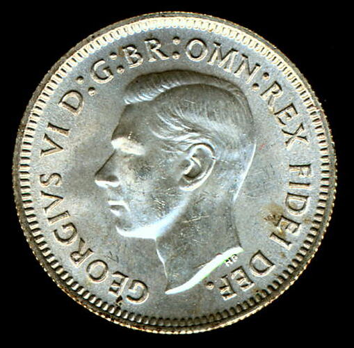 A silver coin (19 mm diameter with milled edge) featuring a bare head of George VI facing left; around, GEORGIVS VI D:G:BR:OMN:REX FIDEI DEF. ; below bust in small lettering the artist's initials H.P.. The reverse features the Ensigns Armorial of the Commonwealth of Australia, as authorised by Royal Warrent 7th May 1908 - composed of a simple shield enclosing a cross of Saint George on which are five six-pointed stars, around the outside of which are six small escutcheons, i.e., small shields. The shield is supported by a kangaroo and an emu standing on a grassy mound. Above the shield a crest, the seven-pointed star of Federation on a wreath. Below on a ribbon the motto ADVANCE AUSTRALIA is inscribed. Around above, SIXPENCE and below, between arrow heads, the date, 1951. Above the date is the mint mark PL.