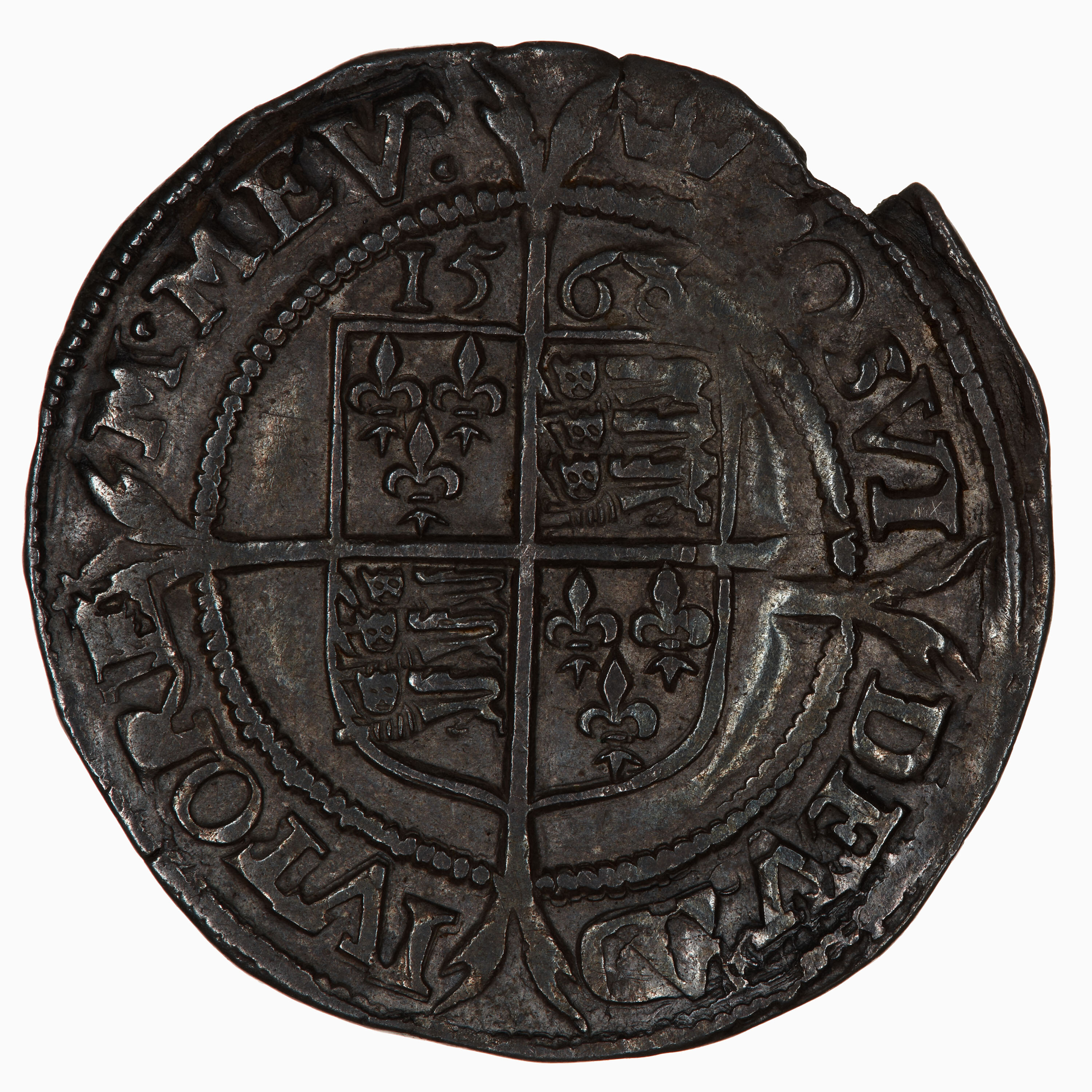 At centre within a beaded circle and over a long cross fourchee, a plain square topped shield quartered with the arms of France (1 & 4) and England (2 & 3); above, 1568; around, (mm. coronet) POSVI DEV ADIVTOREM MEV (translation, I have made God my helper)