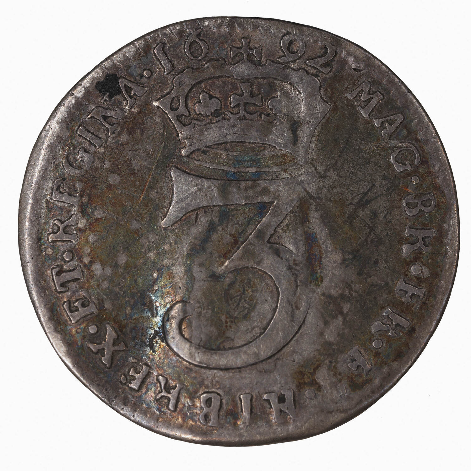 At the centre a large numeral 3 below a crown; around, MAG BR FR ET HIB REX ET REGINA 1692 (the date is divided by the top of the crown)