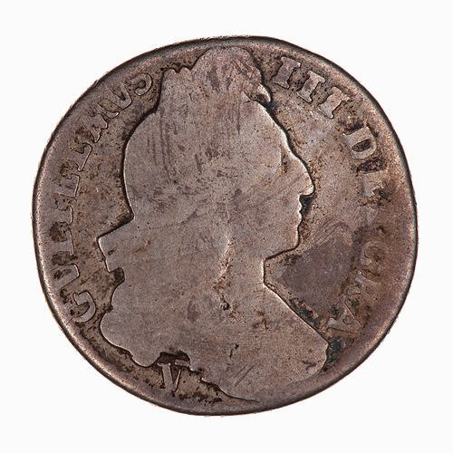 Laureate bust of the King facing right; around, GVLIELMVS III DEI GRA; mint mark y below bust