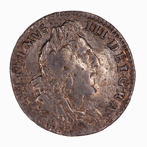 Laureate bust of the King facing right; around, GVLIELMVS III DEI GRA; mint mark B below bust