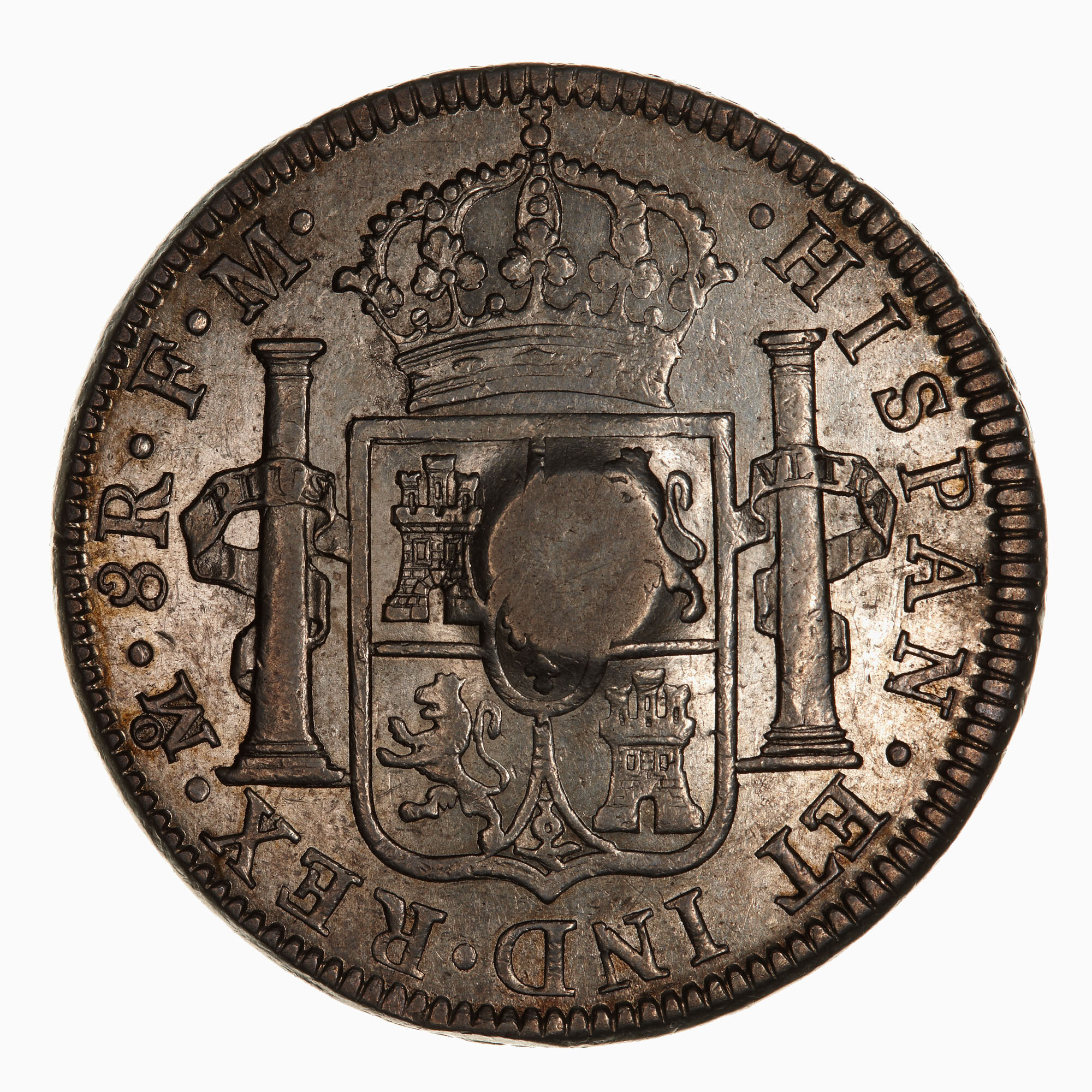Crowned square topped shield quartered with lions and castles between two pillars; incuse on ribbon draped around pillars, PLUS ULTRA; around HISPAN ET IND REX Mo (monogram) 8R FM