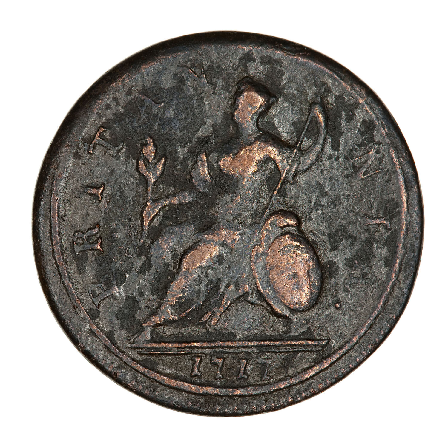 Britannia seated facing left holding an olive branch and a spear; resting at right, a shield; around, BRITANNIA.; in exergue, 1717.