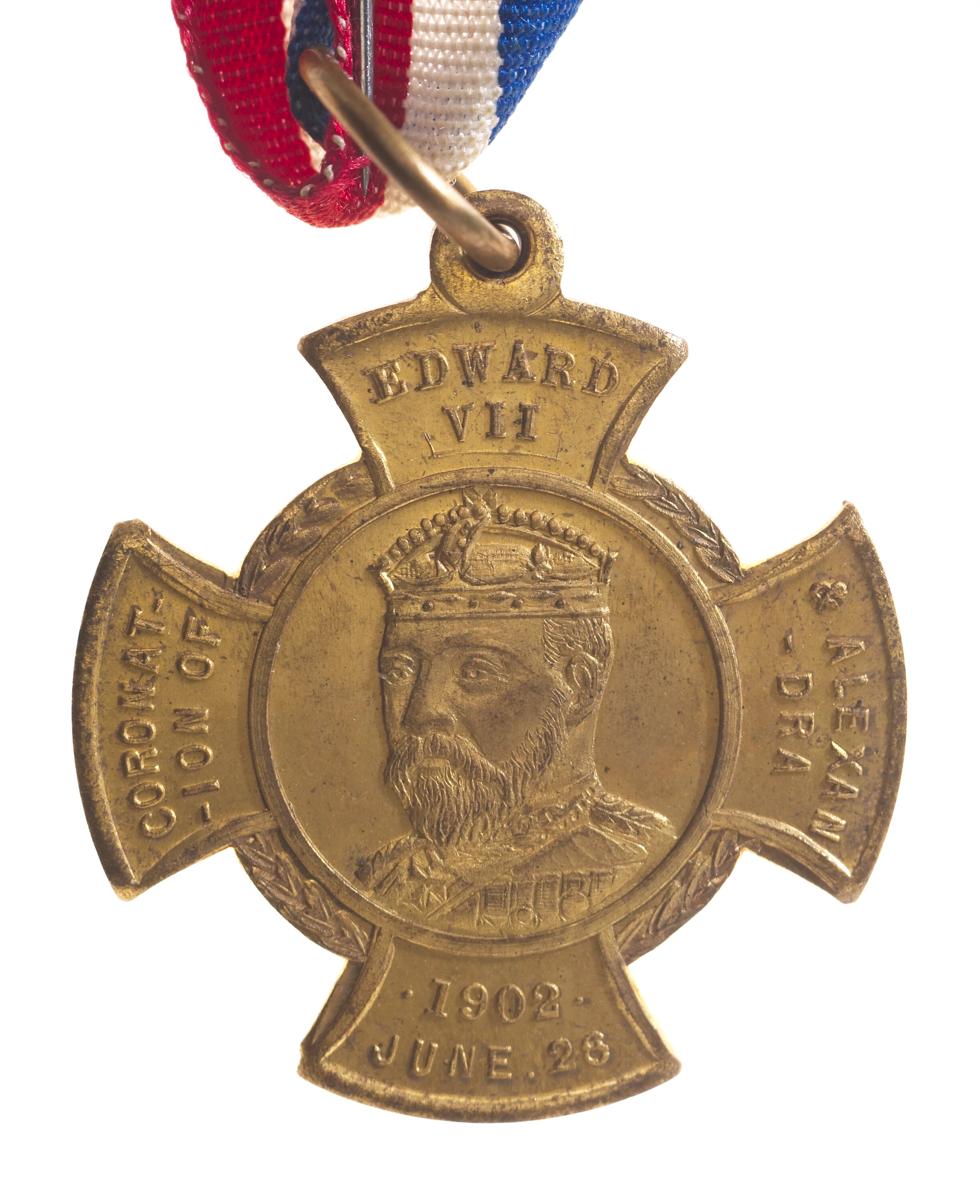 Struck on a cross shaped blank; at centre of cross, within solid circle a 3/4 left facing bust of Edward VII crowned; on arms of cross, top, EDWARD / VII right, & ALEXAN- / DRA; left, CORONAT- / ION OF ; bottom, - 1902 JUNE 26