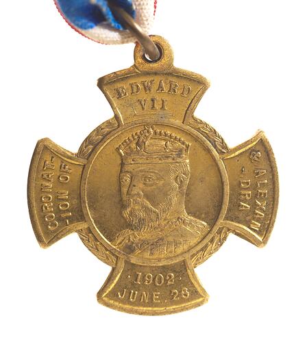 Struck on a cross shaped blank; at centre of cross, within solid circle a 3/4 left facing bust of Edward VII crowned; on arms of cross, top, EDWARD / VII right, & ALEXAN- / DRA; left, CORONAT- / ION OF ; bottom, - 1902 JUNE 26