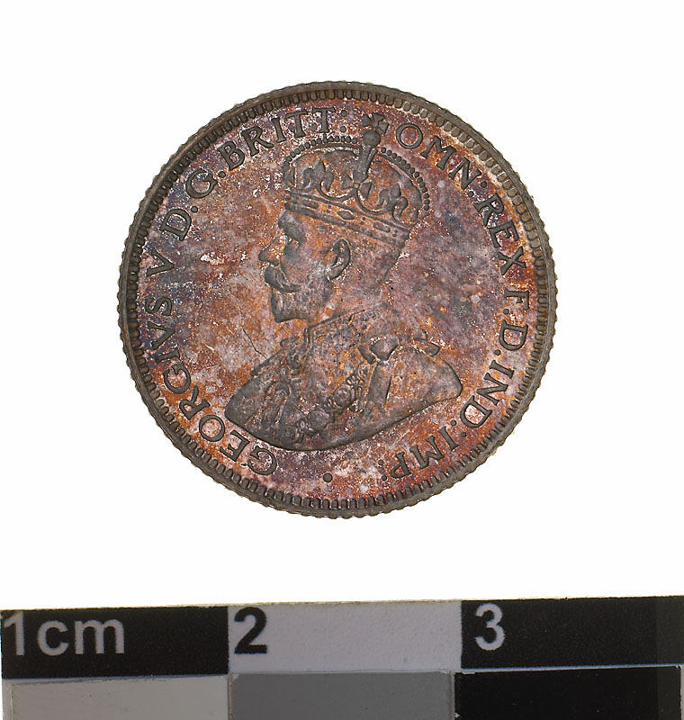 A silver coin (19 mm diameter with milled edge) featuring a crowned and robed bust of George V facing left; around, GEORGIVS V D.G. BRITT: OMN: REX F.D. IND: IMP: ; below bust in small lettering the artist's initials B.M.. The reverse features the Ensigns Armorial of the Commonwealth of Australia, as authorised by Royal Warrent 7th May 1908 - composed of a simple shield enclosing a cross of Saint George on which are five six-pointed stars, around the outside of which are six small escutcheons, i.e., small shields. The shield is supported by a kangaroo and an emu standing on a grassy mound. Above the shield a crest, the seven-pointed star of Federation on a wreath. Below on a ribbon the motto ADVANCE AUSTRALIA is inscribed. Around above, SIXPENCE and below, between arrow heads, the date, 1927.