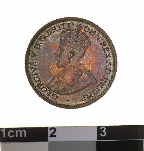A silver coin (19 mm diameter with milled edge) featuring a crowned and robed bust of George V facing left; around, GEORGIVS V D.G. BRITT: OMN: REX F.D. IND: IMP: ; below bust in small lettering the artist's initials B.M.. The reverse features the Ensigns Armorial of the Commonwealth of Australia, as authorised by Royal Warrent 7th May 1908 - composed of a simple shield enclosing a cross of Saint George on which are five six-pointed stars, around the outside of which are six small escutcheons, i.e., small shields. The shield is supported by a kangaroo and an emu standing on a grassy mound. Above the shield a crest, the seven-pointed star of Federation on a wreath. Below on a ribbon the motto ADVANCE AUSTRALIA is inscribed. Around above, SIXPENCE and below, between arrow heads, the date, 1928.