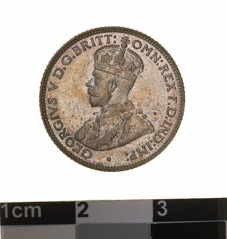 A silver coin (19 mm diameter with milled edge) featuring a crowned and robed bust of George V facing left; around, GEORGIVS V D.G. BRITT: OMN: REX F.D. IND: IMP: ; below bust in small lettering the artist's initials B.M.. The reverse features the Ensigns Armorial of the Commonwealth of Australia, as authorised by Royal Warrent 7th May 1908 - composed of a simple shield enclosing a cross of Saint George on which are five six-pointed stars, around the outside of which are six small escutcheons, i.e., small shields. The shield is supported by a kangaroo and an emu standing on a grassy mound. Above the shield a crest, the seven-pointed star of Federation on a wreath. Below on a ribbon the motto ADVANCE AUSTRALIA is inscribed. Around above, SIXPENCE and below, between arrow heads, the date, 1934.