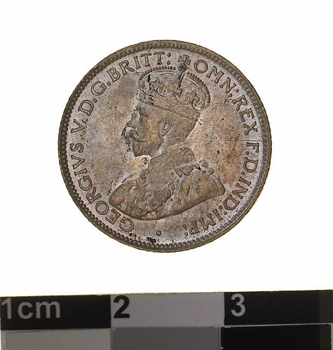A silver coin (19 mm diameter with milled edge) featuring a crowned and robed bust of George V facing left; around, GEORGIVS V D.G. BRITT: OMN: REX F.D. IND: IMP: ; below bust in small lettering the artist's initials B.M.. The reverse features the Ensigns Armorial of the Commonwealth of Australia, as authorised by Royal Warrent 7th May 1908 - composed of a simple shield enclosing a cross of Saint George on which are five six-pointed stars, around the outside of which are six small escutcheons, i.e., small shields. The shield is supported by a kangaroo and an emu standing on a grassy mound. Above the shield a crest, the seven-pointed star of Federation on a wreath. Below on a ribbon the motto ADVANCE AUSTRALIA is inscribed. Around above, SIXPENCE and below, between arrow heads, the date, 1935.