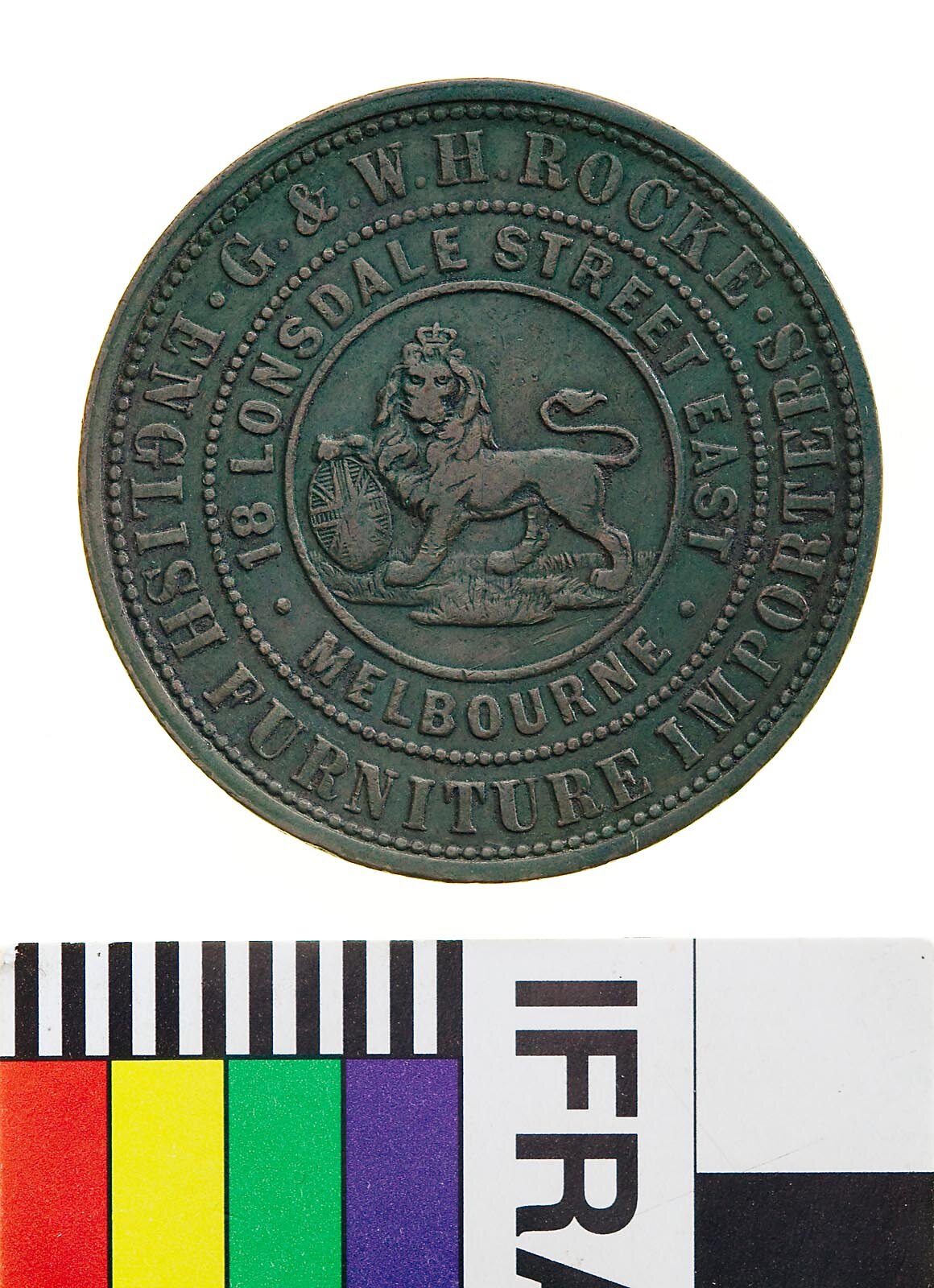 Obverse: G.&.W.H.ROCKE ENGLISH FURNITURE IMPORTERS 18 LONSDALE STREET EAST MELBOURNE Reverse: MELBOURNE VICTORIA 1859