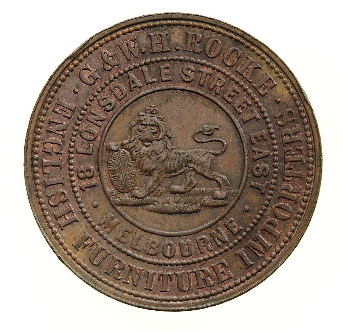 Obverse: G & W.H. ROCKE ENGLISH FURNITURE IMPORTERS 18 LONSDALE STREET EAST MELBOURNE Reverse: MELBOURNE VICTORIA 1859