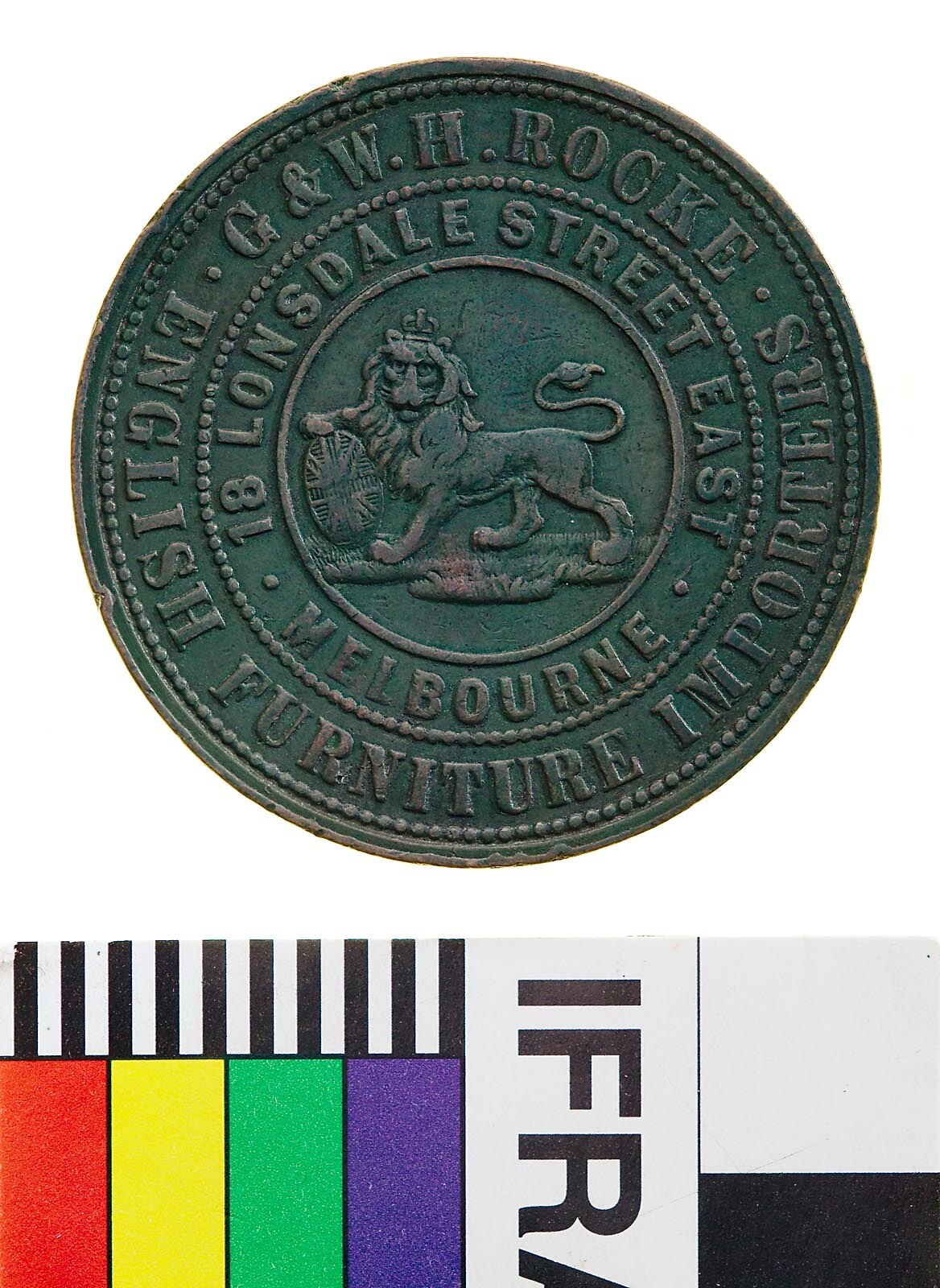 Obverse: G & W.H. ROCKE ENGLISH FURNITURE IMPORTERS 18 LONSDALE STREET EAST MELBOURNE Reverse: MELBOURNE VICTORIA 1859