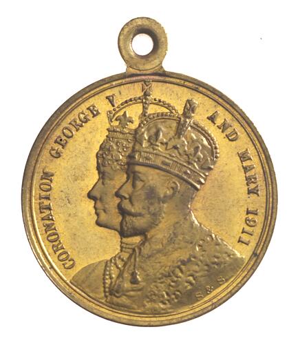 Other Details: Medal issued to celebrate the coronation of King George V and Queen Mary in 1911. George ascended the throne on his father's death on 9 May 1910. During his reign, which spanned World War I, the royal house abandoned the title the house of Saxe-Coburg-Gotha (or the house of Hanover or Brunswick) and became known as the house of Windsor. George died in 1936, and was succeeded briefly by Edward VIII.