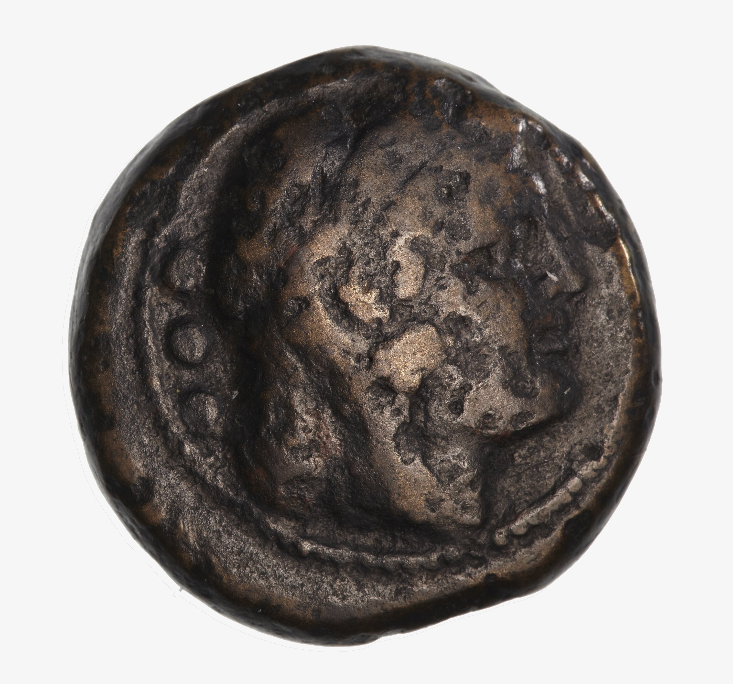 Head of Hercules wearing the lion's skin; behind, three beads, line border