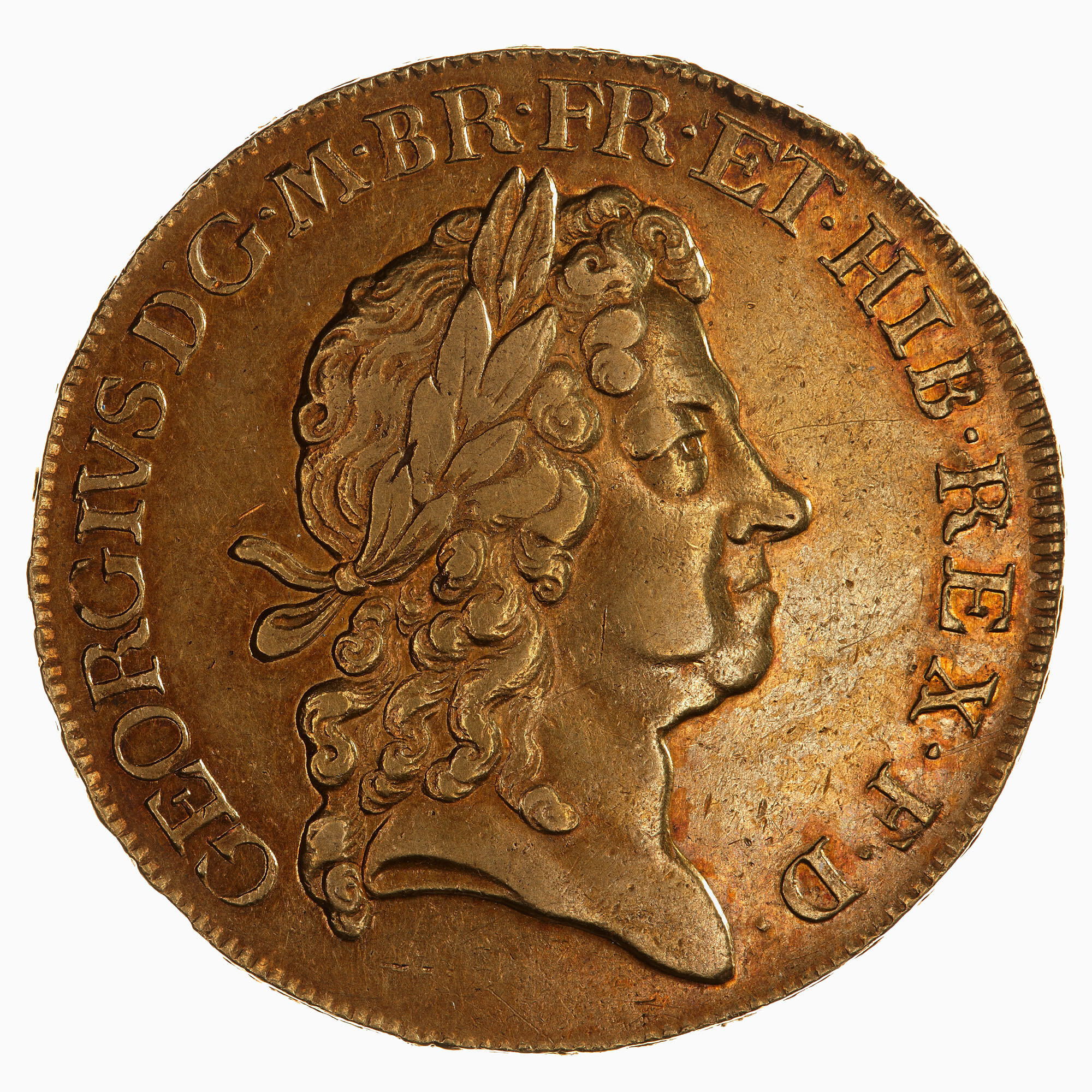 Laureate head of George I facing right; around, GEORGIVS D G M BR FR ET HIB REX F D (translation: George I by the Grace of God King of Great Britain, France and Ireland, Defender of the Faith)