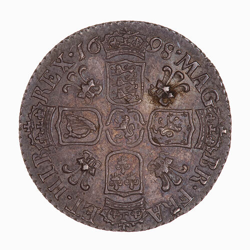 Crowned shields of England, Scotland, France and Ireland forming a cross shape around the arms of Nassau at the centre; between the shields, Welsh plumes; around, MAG BR FRA ET HIB REX 1698, the date being divided by the crown over the shield of England