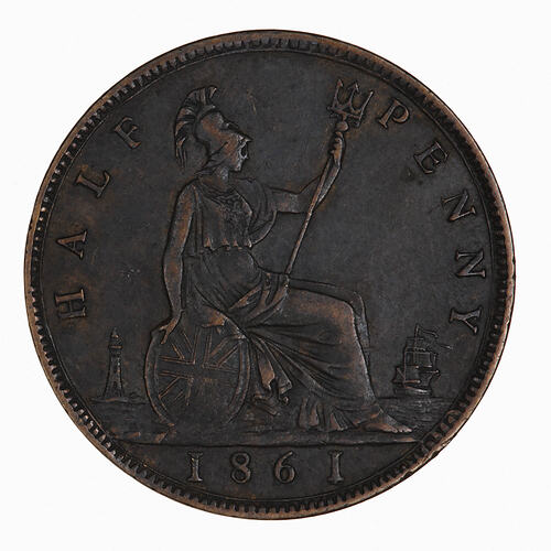 Britannia seated facing right on a rock wearing a helmet and breastplate with flowing dress; she holds a trident and rests her right hand on a shield which bears the combined crosses of the Union Flag; at right a ship sailing away; at left, a lighthouse; around, HALF PENNY; in exergue, 1861