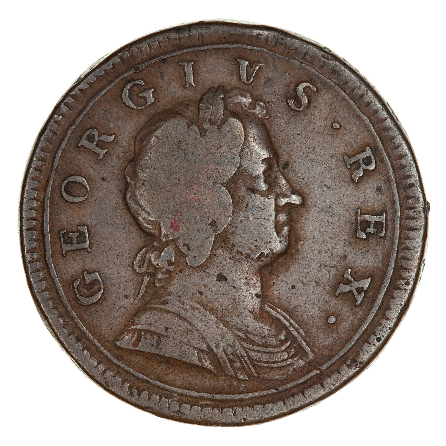 Laureate bust of George I (second obverse) in armour facing right; around, GEORGIVS REX (translation: King George)