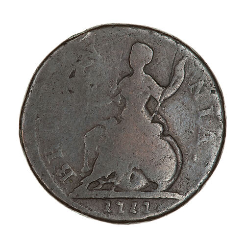 Britannia seated facing left holding an olive branch and a spear; resting at right, a shield; around, BRITANNIA.; in exergue, 1717