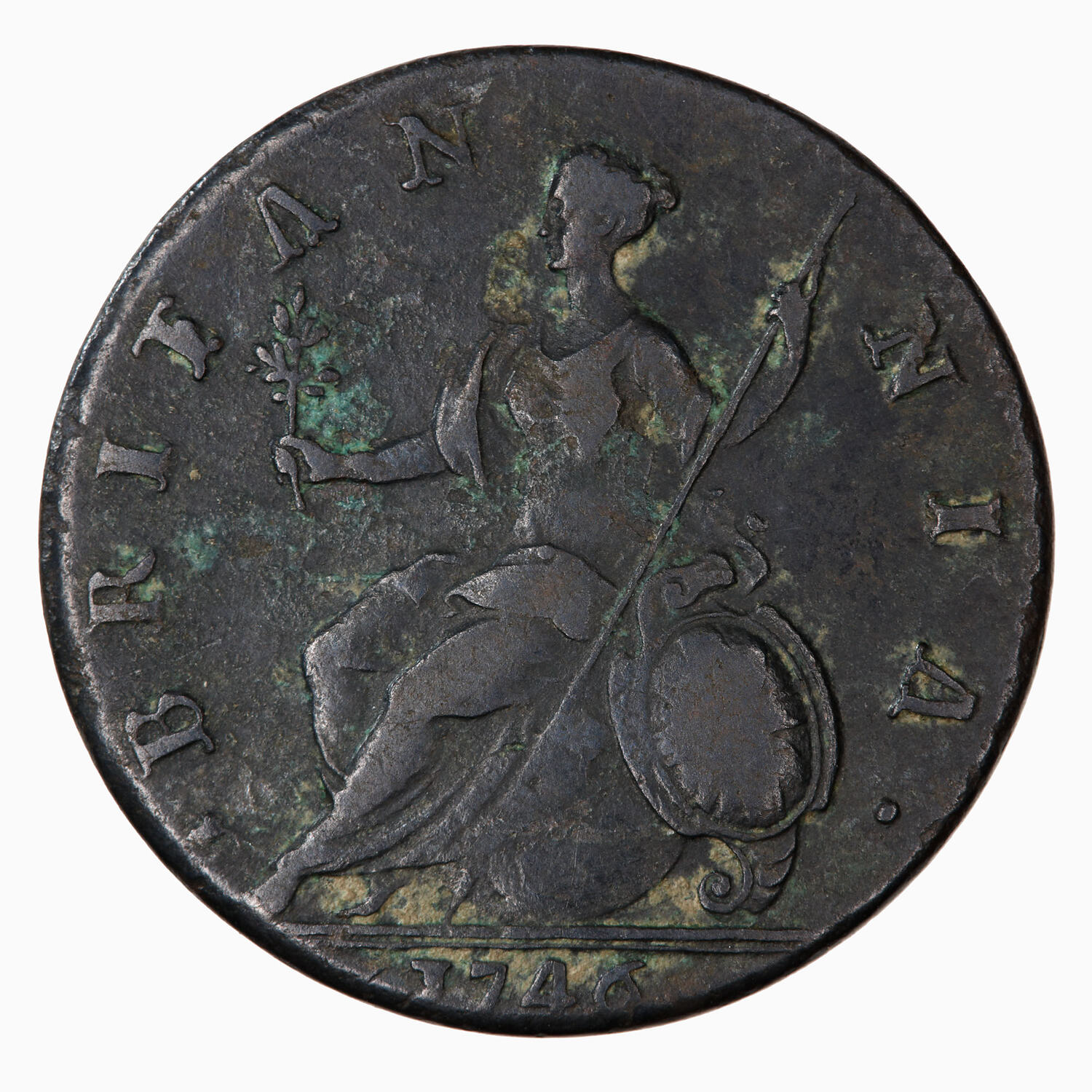 Britannia seated facing left on globe, extending olive branch and holding spear, by her side rests a shield decorated with the combined crosses of St. George and St. Andrew; around, BRITANNIA.; in exergue, 1746