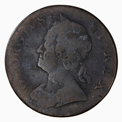 Old laureate bust of George II facing left wearing armour; around, GEORGIVS II REX
