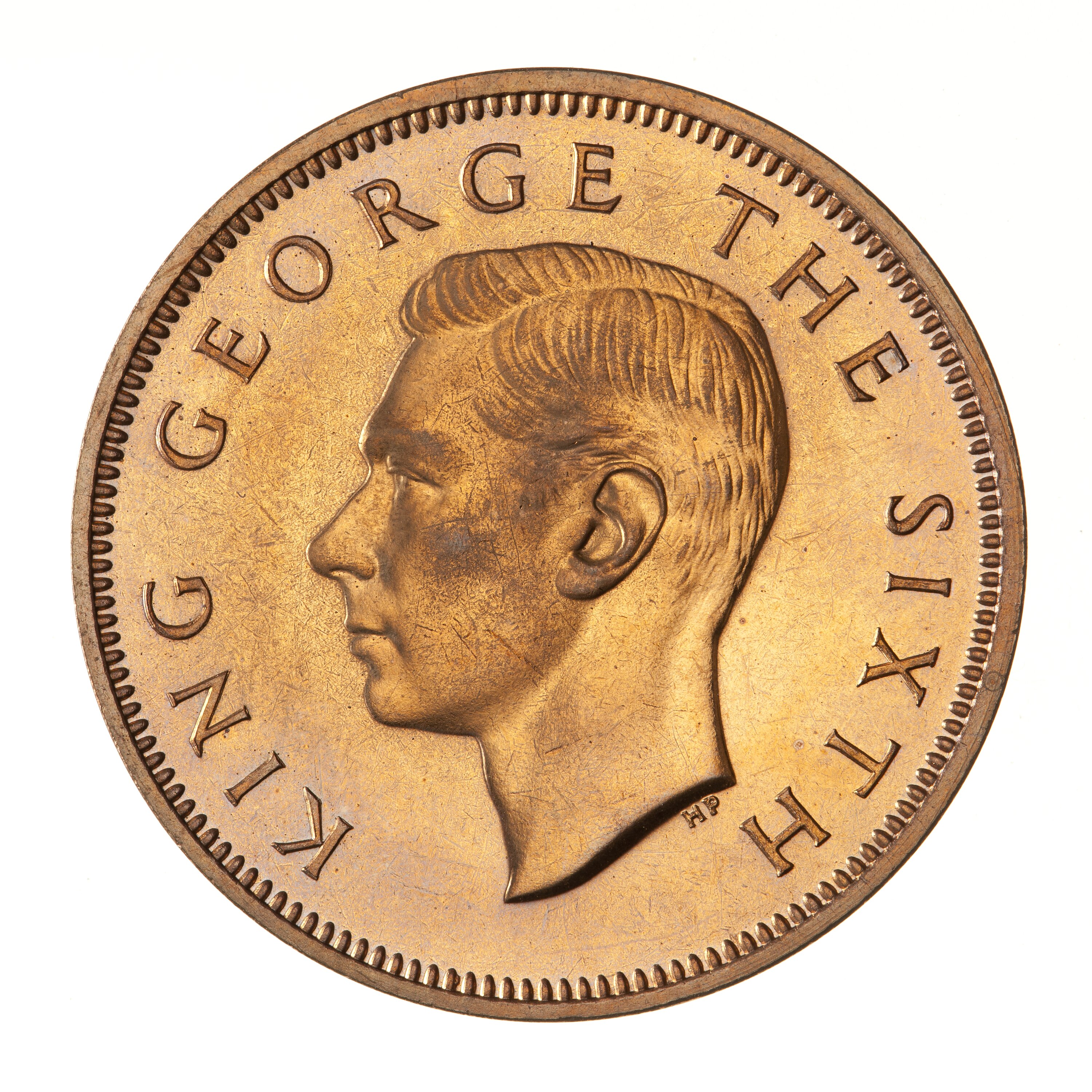 Bare head of the king facing left; around, KING GEORGE THE SIXTH; below neck in small letters the artist's initials, HP (Humphrey Paget)