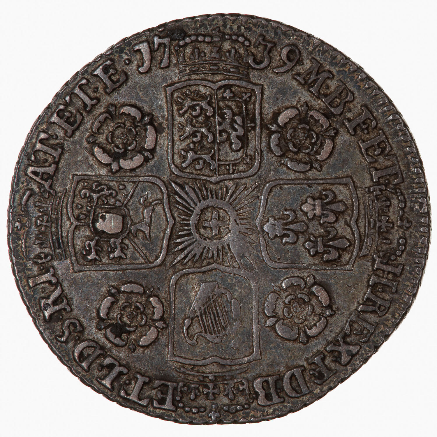Four crowned shields arranged to form a cross, England and Scotland impaled, France, Ireland and the Electorate of Brunswick and Luneburg; Star of the Garter at the centre; a rose in each angle; around, M B F ET H REX F D B ET L D S R I A T ET E 1739, the date being broken by a crown. (Translation obverse and reverse: George II by the Grace of God King of Great Britain, France and Ireland, Duke of Brunswick and Luneburg, Archi-Thesaurius and Elector of the Holy Roman Empire).