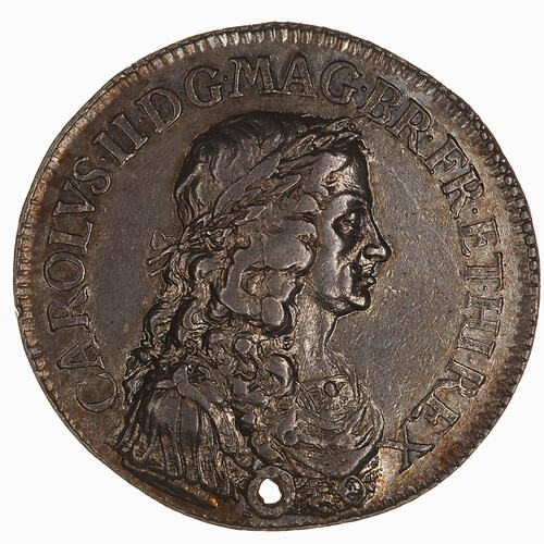 Laureate and draped bust of Charles II wearing armour, facing right; around, CAROLVS . II . D . G. M . BR . FR . ET . HI . REX; small S below bust (?)