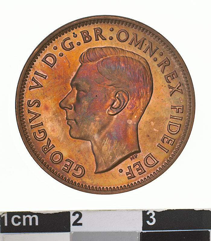 Bare head of George VI facing left; around, GEORGIVS VI D: G: BR: OMN: REX FIDEI DEF. ; below the head in small lettering the artist's initials HP.