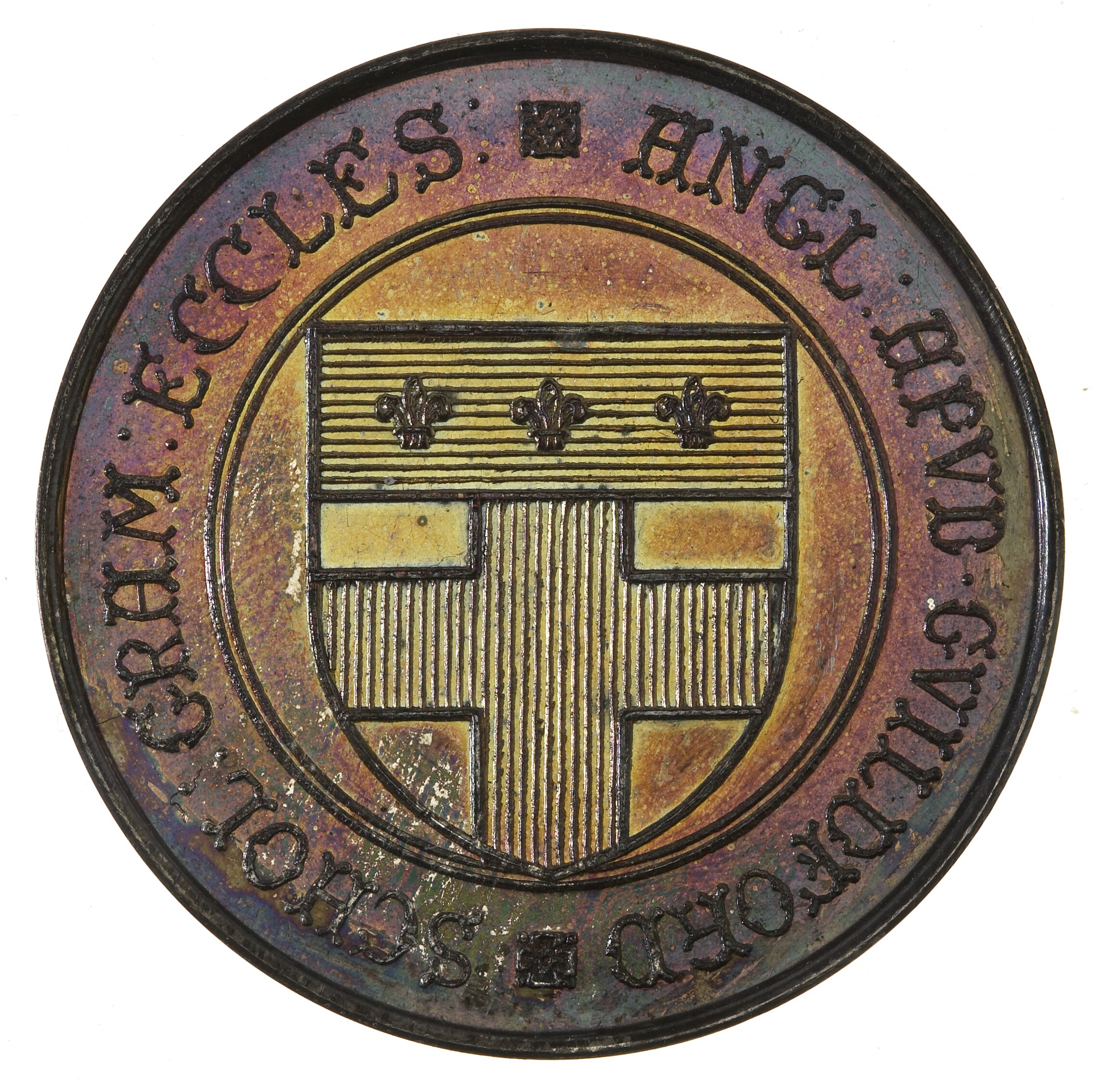 School shield, around on broad rim, + ANGL: APVD. GUILDFORD * SCHOL: GRAM: ECCLES:.