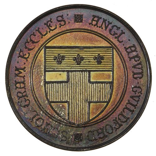 Obverse: 'ANGL: APVD. GUILDFORD SCHOL: GRAM: ECCLES:'. Reverse: 'ANNUAL ATHLETIC SPORTS GO FORWARD C.E.G.S. PRIZE AWARDED TO'.